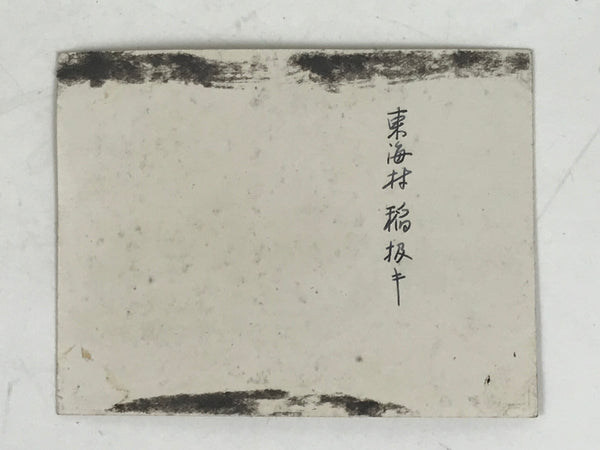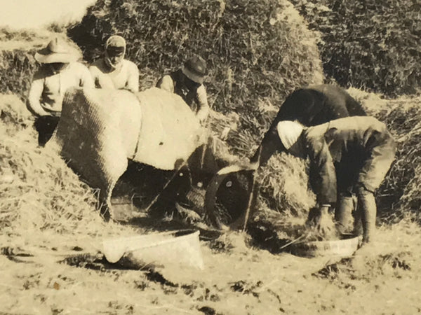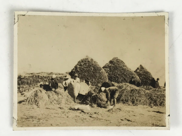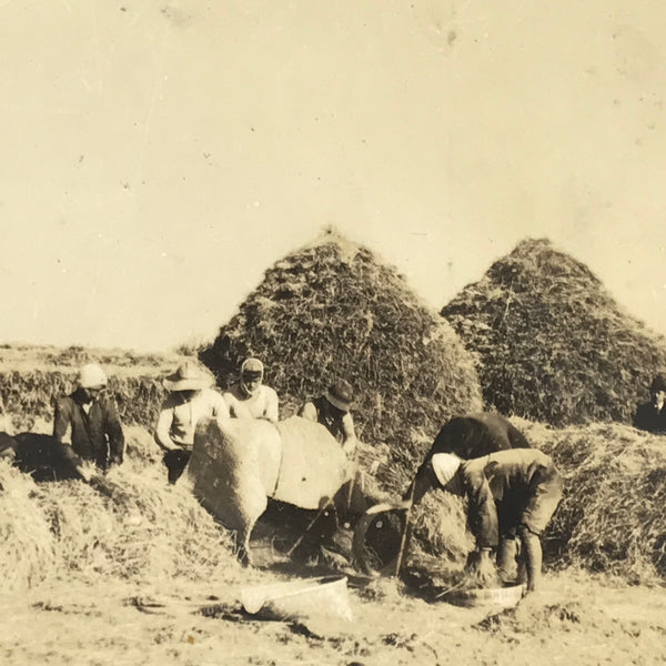 This is a vintage Japanese sepia-tone Showa-era photograph of a group of people threshing rice in a field. Threshing rice is the process of separating rice grains from the straw once it is harvested and dried. In this photo, they are smacking bundles of rice against a hard surface, then collect the remaining straw and stack them in giant piles which will then be bundled and processed into other useful items.