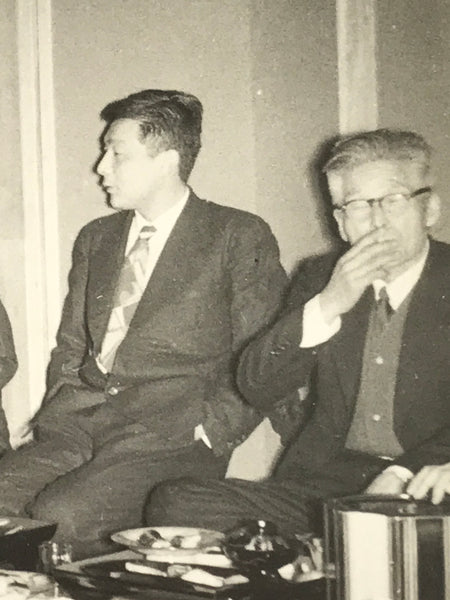 This is an original vintage Showa Era black and white photograph of a group of businessmen posing together during a work party (enkai). There is a geisha in a beautiful kimono between them. There are ozen serving tables on the floor with a kaiseki meal and sake bottles and cups.