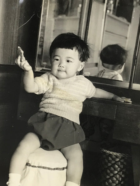 This is an original vintage Showa-era black and white portrait photograph of a young boy (maybe a year old) sitting on a stool at a vanity table eating a cookie. He is wearing a knitted short-sleeve sweater and diaper cover.