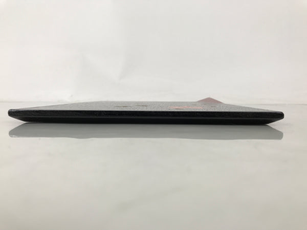 This is a vintage Japanese lacquered wooden tray or plate. It is mostly lacquered black with a decorative red upturned corner. It features a momiji maple leaf in an orange-red color and sakura cherry blossoms in gold. This beautiful plate is perfect for display as well as entertaining.