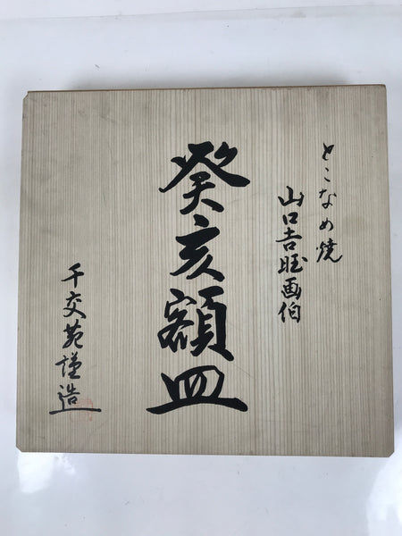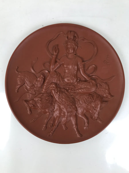 This is a vintage Japanese decorative ceramic plate Gakuzara. This Tokoname ware large plate is reddish brown with a detailed image of the Buddhist image Kannon on wild boars. This plate comes with the original wooden box. A resin stand isn't included, though it's in the first photo.