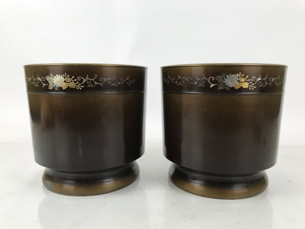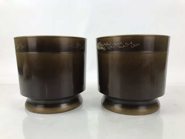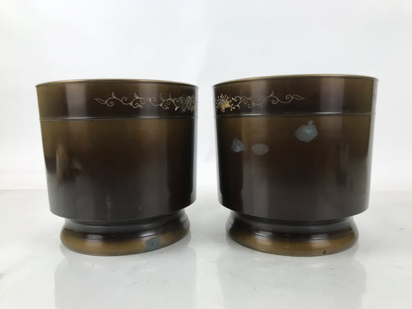 This is a pair of Japanese vintage brazier fire pits, also known as hibachi. The metal brazier has a smooth side and a floral design on the upper part. It is brown, and the floral design is gold and silver. This pair comes with the original wooden box with an inscription.