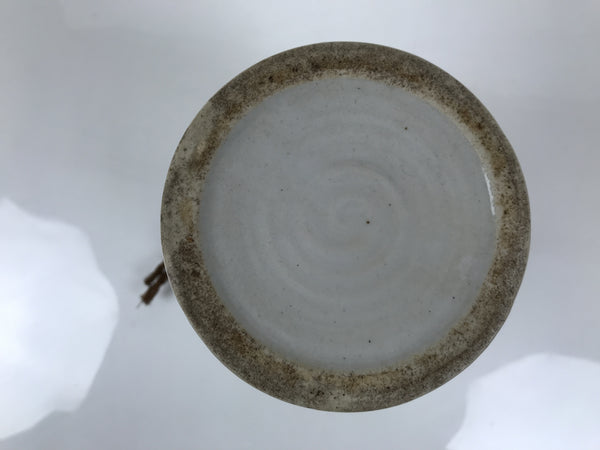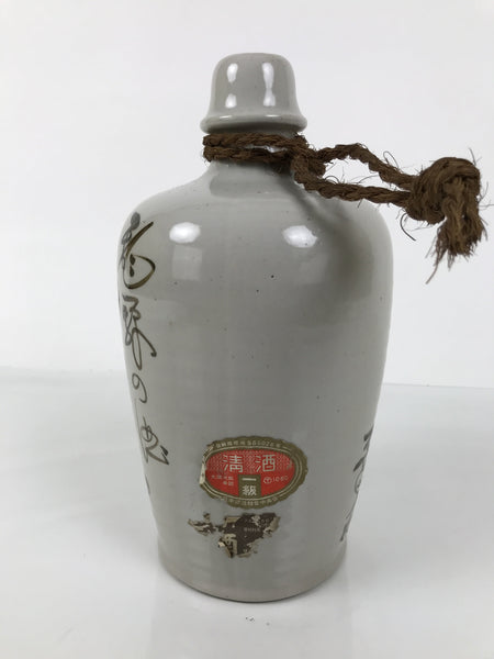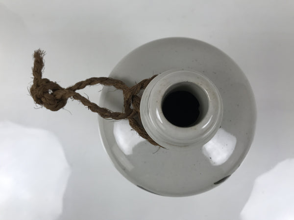 This is a vintage Japanese ceramic sake bottle. It is called a Kayoi-Tokkuri and is used to pour sake. The commuting sake bottle became popular as a rental container for liquor stores in the Edo period when sake began to be consumed daily. This gray bottle has brown characters and a brown string around the neck. There is a sticker on the side.