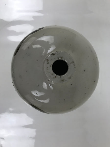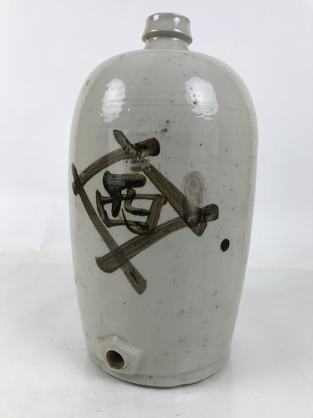 This is an antique Japanese ceramic sake bottle. It is called a Kayoi-Tokkuri and is used to store and pour sake from a hole at the bottom, serving as a spout, though it doesn't have a bung. This pale gray bottle has a Kanji on the body. The commuting sake bottle became popular as a rental container for liquor stores in the Edo period when sake began to be consumed daily.