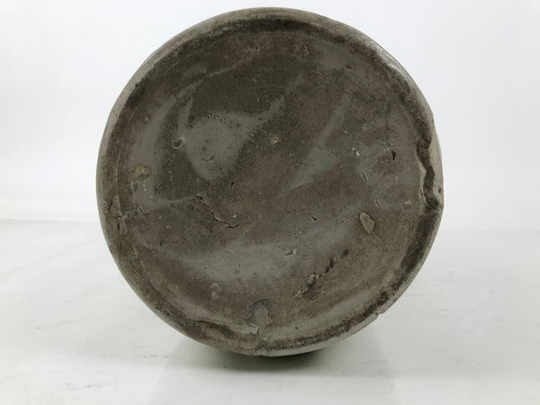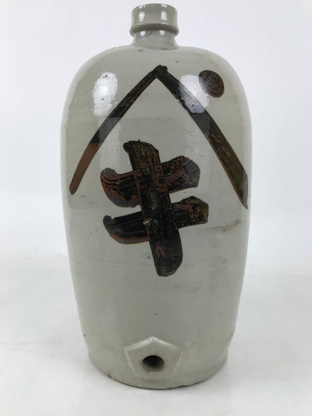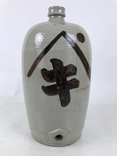 This is an antique Japanese ceramic sake bottle. It is called a Kayoi-Tokkuri and is used to store and pour sake from a hole at the bottom, serving as a spout, though it doesn't have a bung. This pale gray bottle has a Kanji on the body. The commuting sake bottle became popular as a rental container for liquor stores in the Edo period, when sake began to be consumed daily.