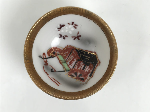 This is a vintage Japanese Kutani porcelain sake cup. This particular type of cup is called tsubomi or "bud type" due to its resemblance to a flower bud. In terms of size, it is also called ochoko. This beautiful imari sake cup is fully decorated with precise gold linework on a brown inner rim. The entire design features a decorated court carriage ox cart, also called gosho guruma. It has the Kutani marking on the bottom.