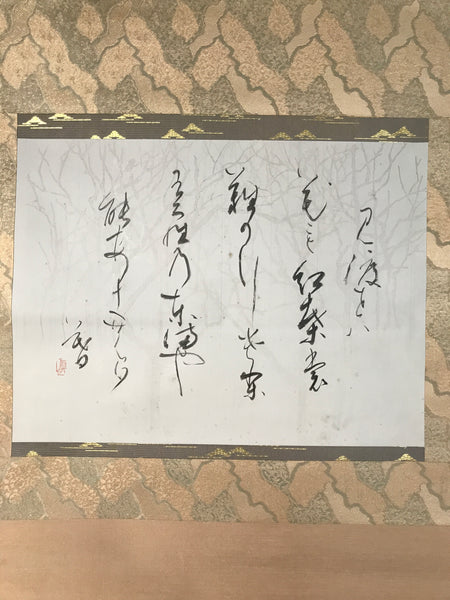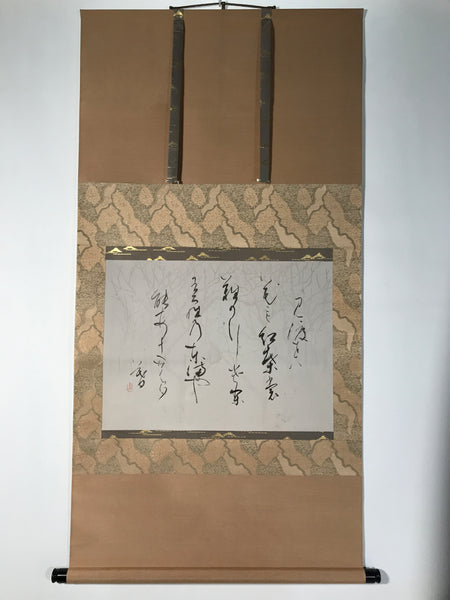 This vintage Japanese boxed hanging scroll (kakejiku or makimono) features calligraphy written in sosho cursive style. This piece is signed with a name and a red seal. The lid has inscriptions on the outside. There is a label on one side of the wooden box.