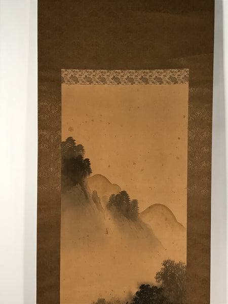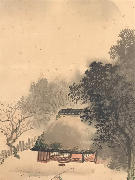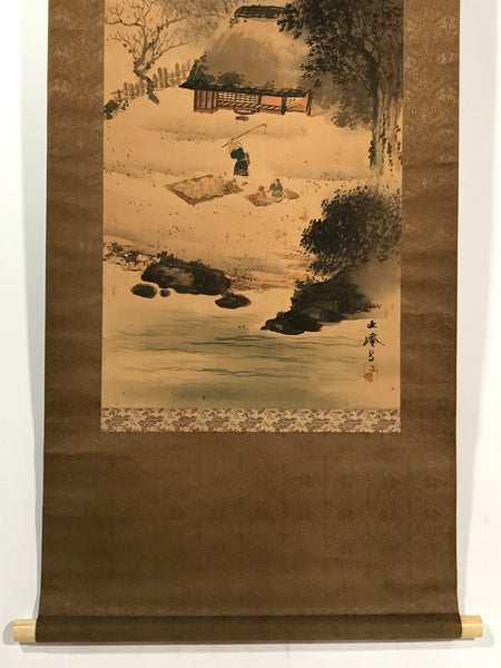 This vintage Japanese hanging scroll (called kakejiku or makimono) features a landscape with a house and people in the foreground, and mountains with trees in the background. This type of kakejiku is called sansui, literally mountains and water. It is painted in color. This piece is signed with a name and a red seal. The box has inscriptions on the lid.