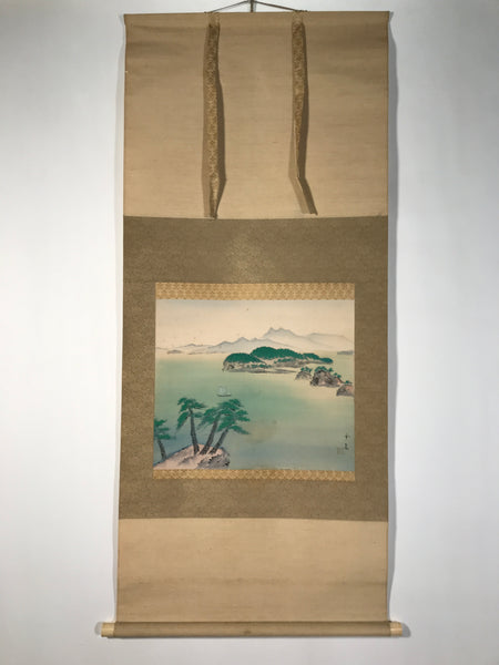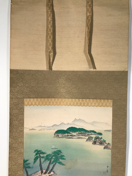 This vintage Japanese hanging scroll (kakejiku or makimono) features a seascape with small islands and trees, and a boat sailing. It pictures Seto Inland Sea. This piece is signed with a name and a red seal. The box has inscriptions on the lid.