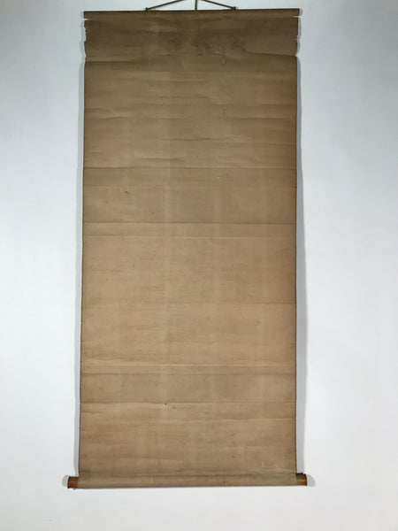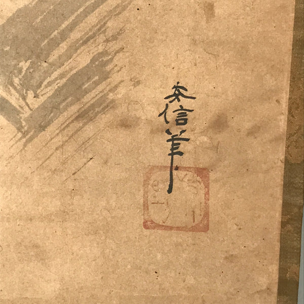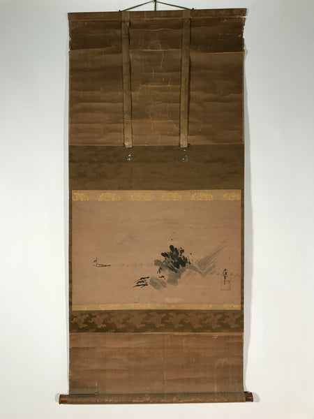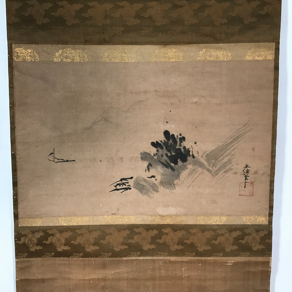 This vintage Japanese hanging scroll (kakejiku or makimono) features an abstract nature design with mountains in the background. It is signed with a name and a red seal.