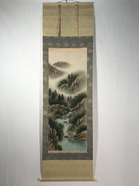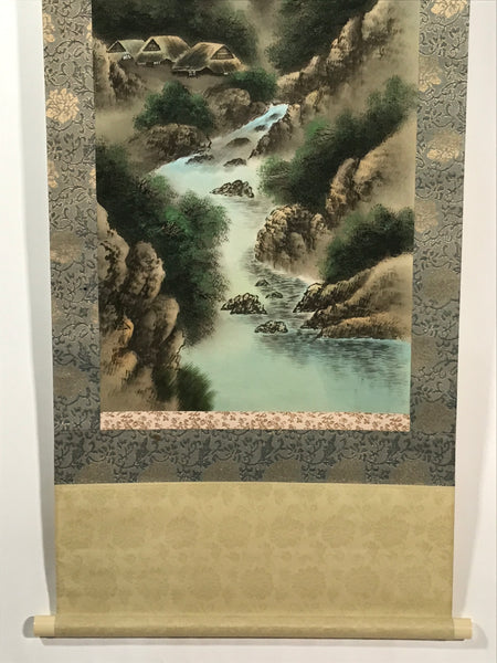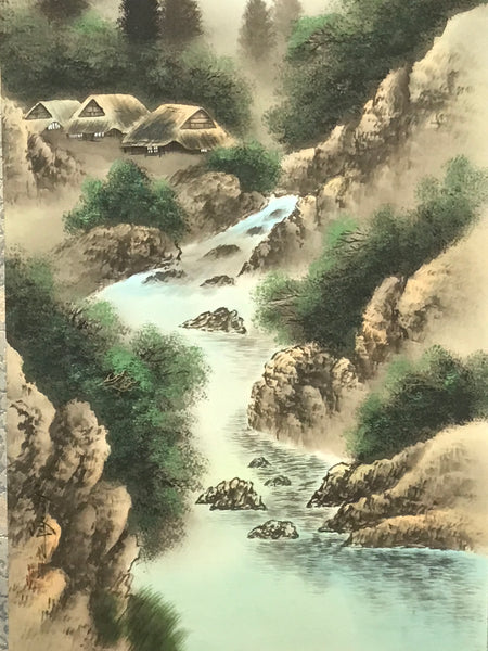 This vintage Japanese hanging scroll (kakejiku or makimono) features a river, trees and some houses. In the background, there are mountains with trees in the fog. This type of kakejiku is called sansui, literally mountains and water. This piece is in color.