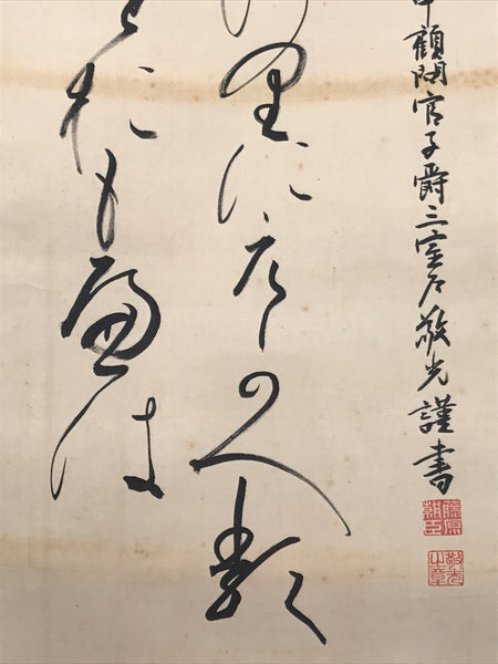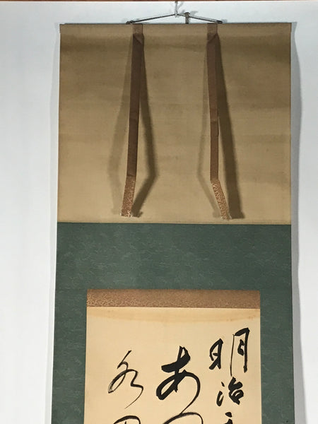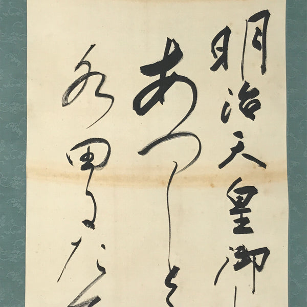 This vintage Japanese hanging scroll (kakejiku or makimono) features calligraphy in sosho cursive style. The poem is a part of a piece of waka (classical Japanese literature) called Meiji Tenno Gyosei, meaning "poetry by the Emperor Meiji". This piece is signed with a name and red seals.