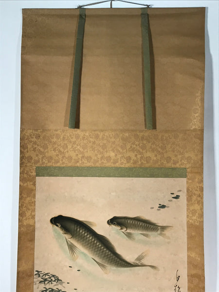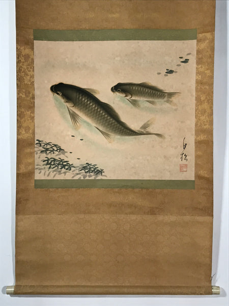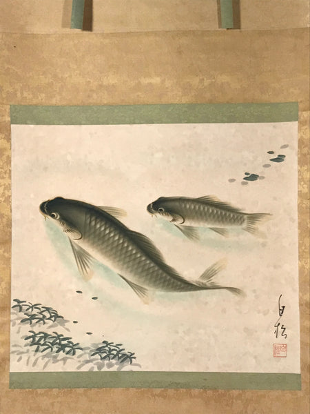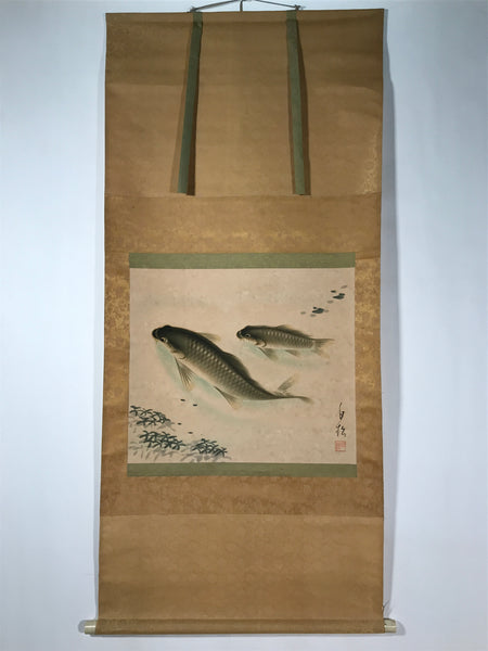This vintage Japanese hanging scroll (kakejiku or makimono) features two green, gray and beige carps swimming in a pond. Some water plants are also pictured. This piece is signed with a name and a red seal.