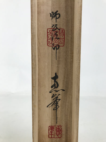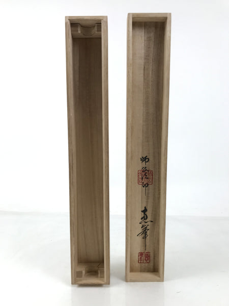 Hand-crafted and in a natural wood color, this sturdy, slender box is made to store a hanging scroll, or kakejiku. The lid fits flush on the top. It has two carved wooden brackets attached to the inside used to keep a scroll in place. This specific box has inscriptions on the inside and outside of the lid, and a red seal on one side.