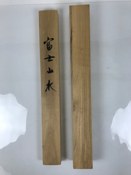 Hand-crafted and in a natural wood color, this sturdy, slender box is made to store a hanging scroll, or kakejiku. The lid fits flush on the top. It has two wooden brackets inside the box to secure the scroll. This specific box has inscriptions on the top and on the inside of the lid.