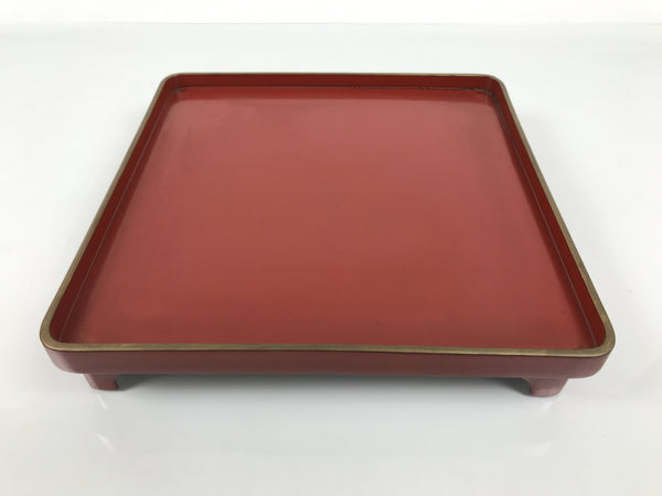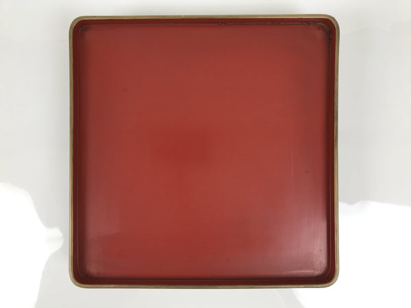 This is a vintage Japanese lacquered wooden table or ozen. This low square table is lacquered a rich red color with a golden border. This table is used on the floor for traditional meals at tea houses, kaiseki restaurants, and ryokan inns. One table is used by only one individual and sometimes it is paired with another smaller ozen.