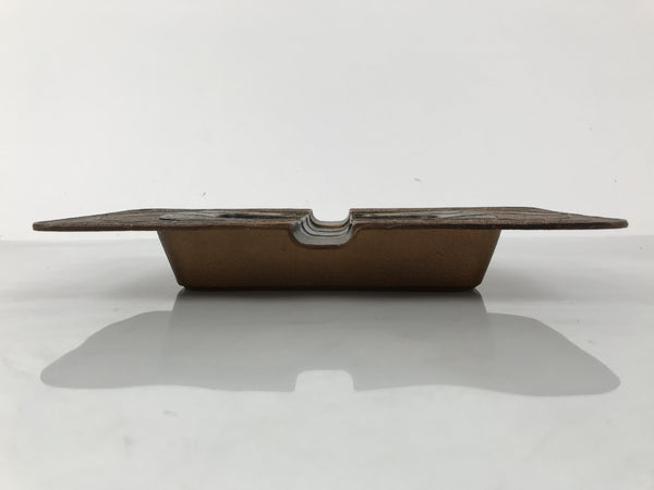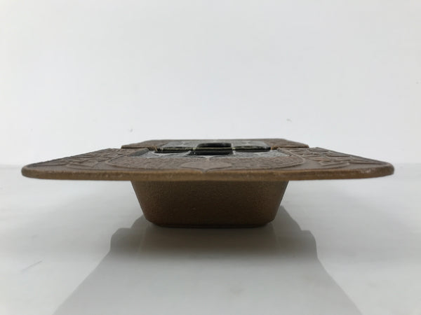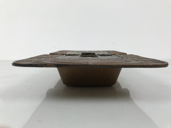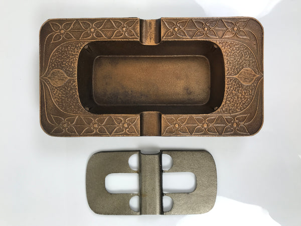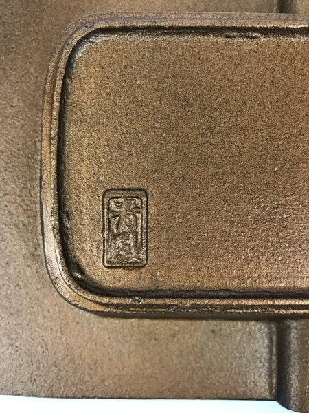 This is a vintage Japanese metal ashtray (haizara). Light brown base and dark brown lid comprise this rectangular ashtray. The base has wide edges with a floral and leaf design that continues on the lid. There are some holes and indentations in the center for holding tobacco. It has a signature on the bottom. It comes with the original cardboard box.