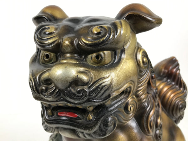 This is a ceramic guardian Shishi statue (foo dog). Painted a bronze color with red accents, this particular statue can also be called komainu or Shisa (Okinawa). They typically come in pairs, one with an open mouth (to frighten away evil) and one with a closed mouth (to keep the good spirits safe inside). This statue has an open mouth and poses with a ball with a dragon and floral motif decorations.