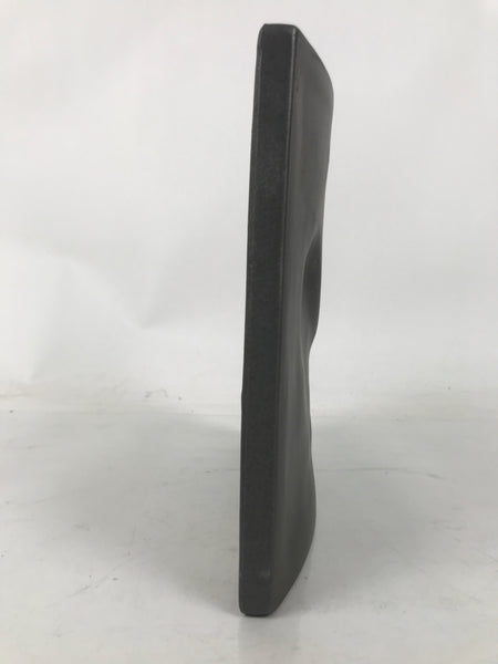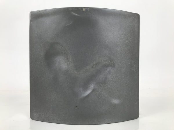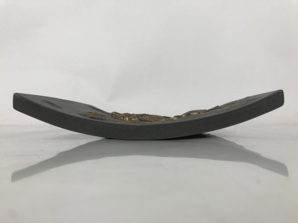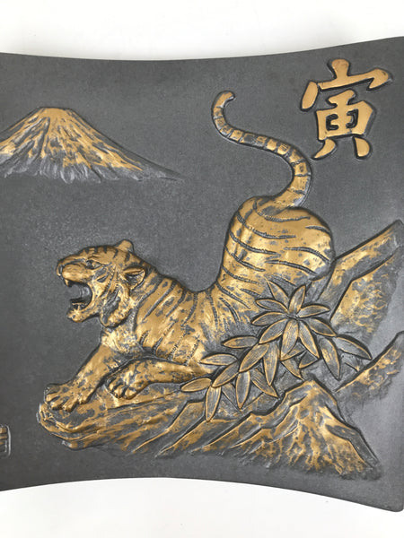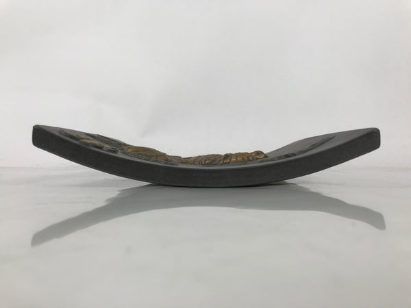 This is a vintage Japanese decorative ceramic plate in the Tokoname ware style. This roof tile-like plate with a zodiac motif is called Eto-gawara, a lucky charm wishing happiness and prosperity. The gray plate features gold reliefs of tiger, bamboo leaves, Kanji letter, and Mt.Fuji. It comes with a resin stand.