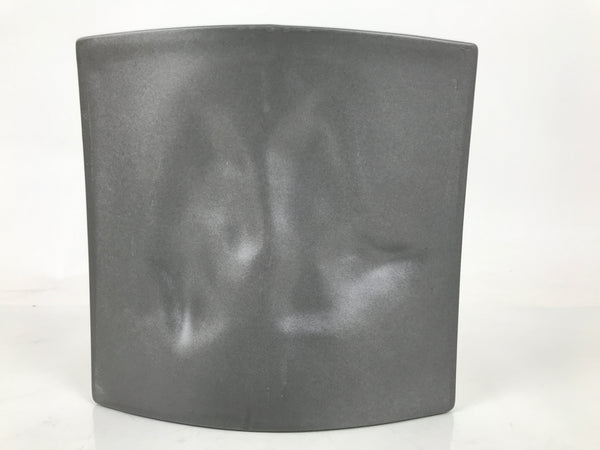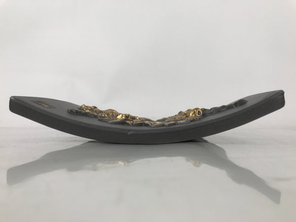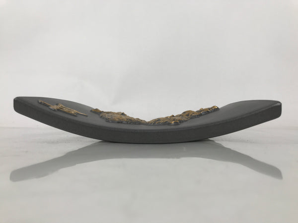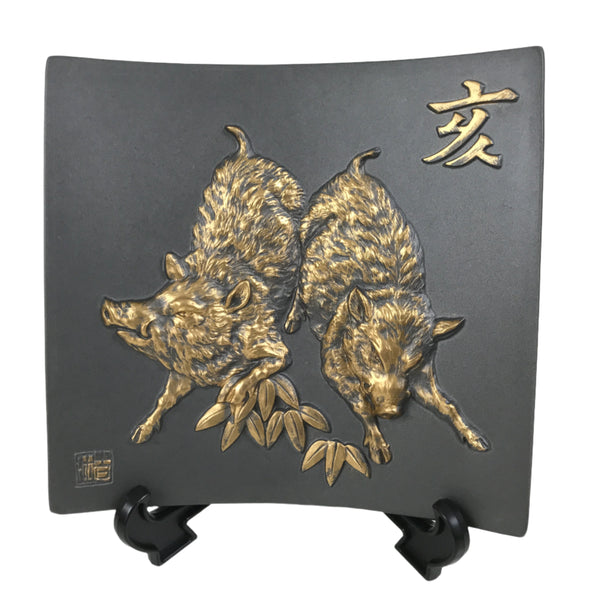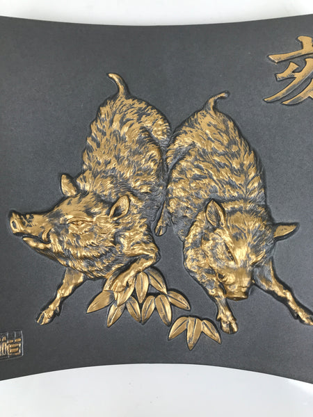 This is a vintage Japanese decorative ceramic plate in the Tokoname ware style. This roof tile-like plate with a zodiac motif is called Eto-gawara, a lucky charm wishing happiness and prosperity. The gray plate features gold reliefs of wild boars, bamboo leaves, and a Kanji letter. It comes with a resin stand. It comes with a resin stand.