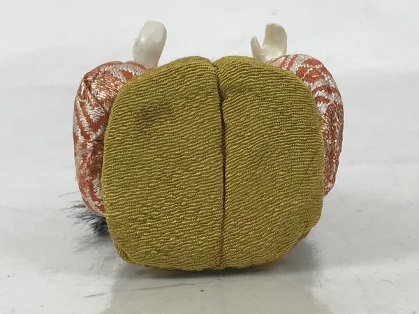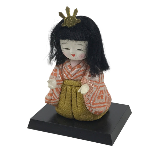 This adorable vintage court lady ohinasama doll dressed in an orange, gold, and white kimono is the perfect addition to any existing hina set or adds gorgeous Eastern flair to any home decor. She typically holds nagae choushi accessory, a sake decanter with a long handle, but this piece is missing. This doll comes with a simple black resin stand. The doll is made in the kimekomi style, which is crafted by adhering and pressing silk fabric onto a carved wooden, resin, or clay base.
