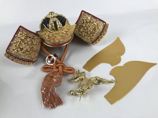 This is a vintage Japanese decorative metal samurai helmet, or kabuto. It has metal decorative maedate. The curled sides, or fukikaeshi, depict chrysanthemum floral motifs in metal pieces and the ornament at the top is a dragon. It has an orange pair of silk tassels tied at the base. It can be disassembled. This helmet comes in a black lacquered wooden box with purple wash paper lining that is used as part of the display. The front of the box has a beautiful gold makie design of plum blossoms, pine trees, and chrysanthemums. In order to help the helmet stand up, there is a small stand as well as a decorative purple cloth to put beneath it.