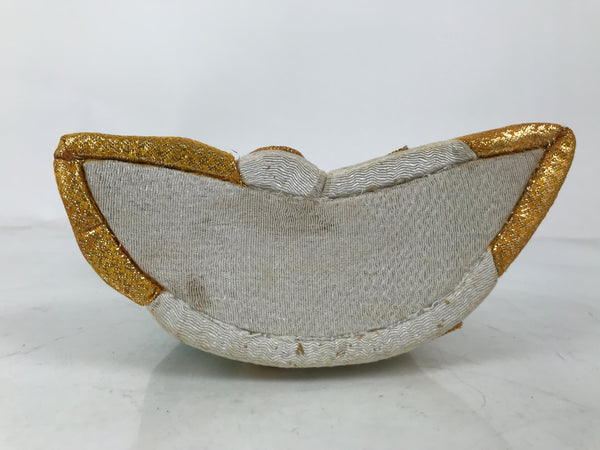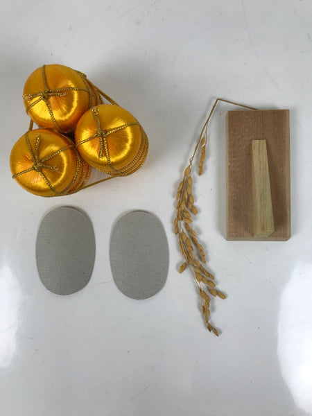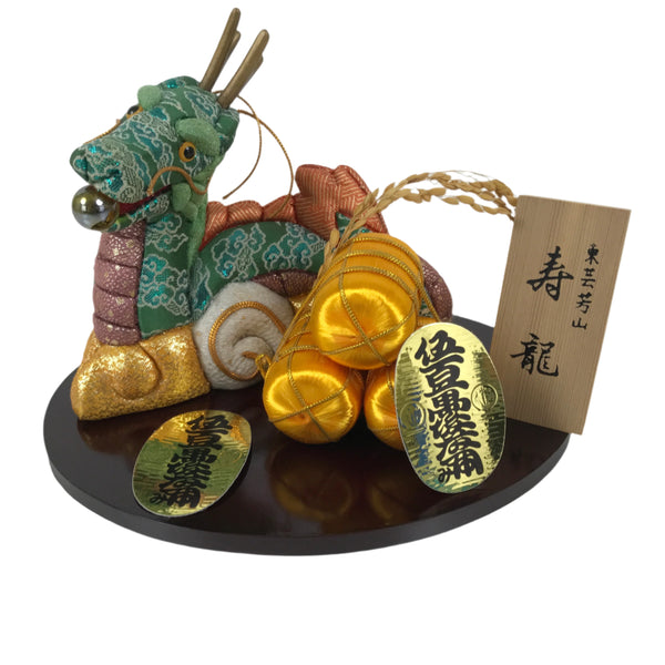 This vintage Japanese Kimekomi fabric doll represents a dragon, one of the Chinese zodiac animals, and is a decoration for the new year to wish for ever-increasing success. It has a wooden base with silk fabric applied according to the kimekomi technique. The dragon is green with a cloud pattern. The lower part of this doll looks like a cloud of gold. A treasure ball is in the dragon's mouth. Golden rice barrels, rice ears, a wooden sign, and a wooden stand are included. It also comes with the extra fabric, paulownia wood powder (used during the crafting process as filler), and the original paper box.