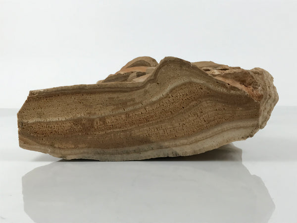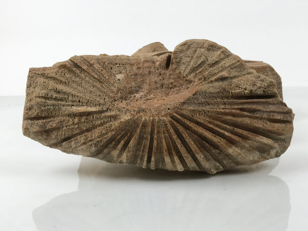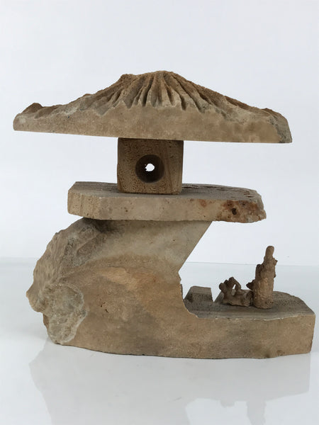 This is a vintage Japanese decorative lantern made by piling brown stones : a firebox with a shade, a platform for the firebox, and a bottom stone. The stone features coarse texture and a natural pattern. It has an artificial, straight surface in some parts and a natural texture in others. There are some cuts, a natural-textured side, and a straight surface with branch-like sculptures on the bottom stone, a shaven-like appearance on the shade. There is a thin wall with a small hole where a candle would go.