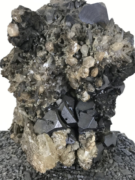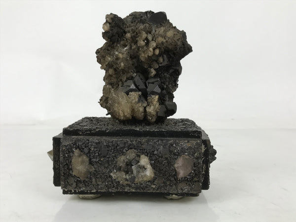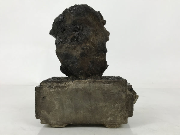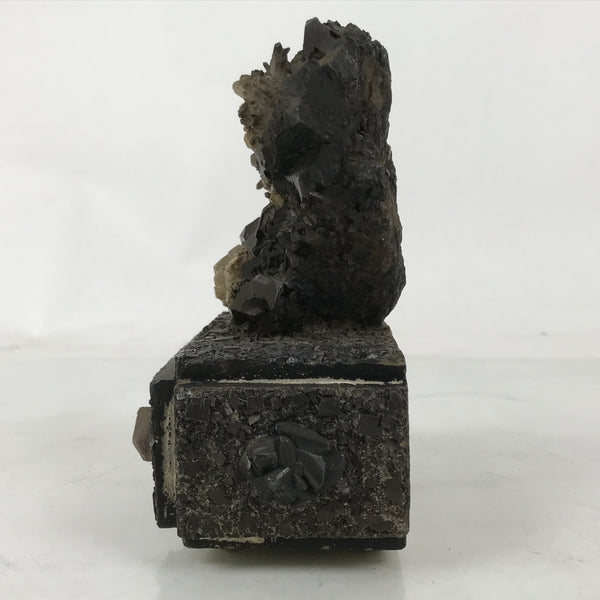 This item is a vintage Japanese viewing stone, also called Suiseki. This statue is a cut of what appears to be galena crystal formations with quartz (not confirmed). It is fixed to a heavy rectangular ceramic base also decorated with stone and crystal fragments.