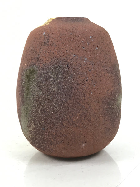 This is a vintage Japanese ceramic flower vase or kabin. This round pot-type vase is brown. It features an ash glaze, a rough-textured surface, and gold paint as accents. The mouth doesn't have a lip. There is a signature on the bottom. It can be used for all types of flower arrangements both ikebana and casual. It comes with the original paper box.