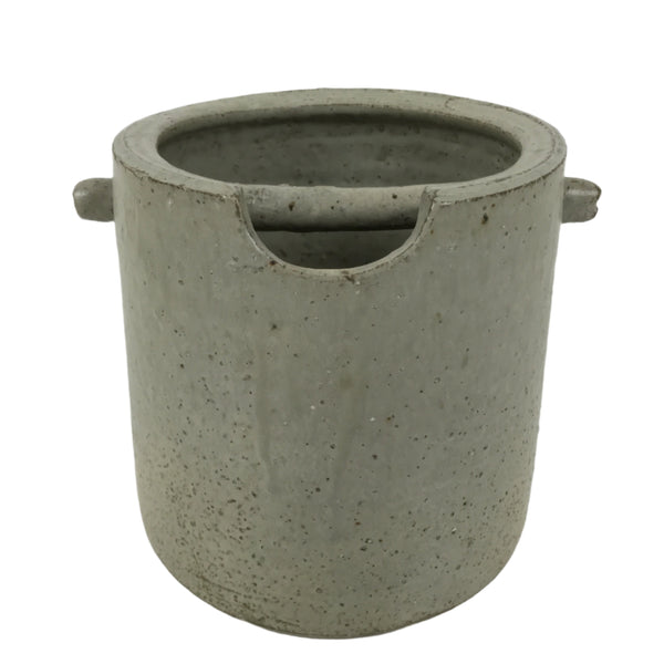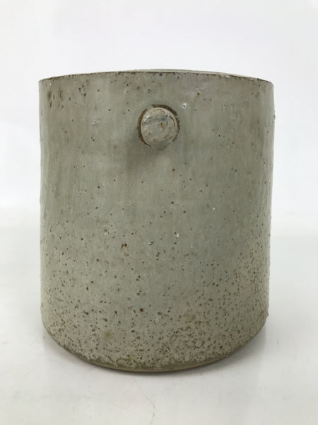 This is a vintage Japanese ceramic flower vase, or kabin. This vase is light gray, likely a Shigaraki ware piece of pottery. It has a cylindrical shape, with a stick passing through the wide mouth and an opening to pour water out. It has a seal on the bottom. It can be used for all types of flower arrangements, both ikebana and casual, and also as a statement piece to decorate your entrance.