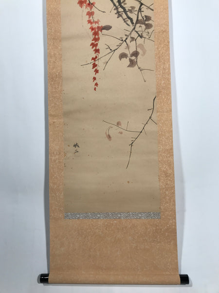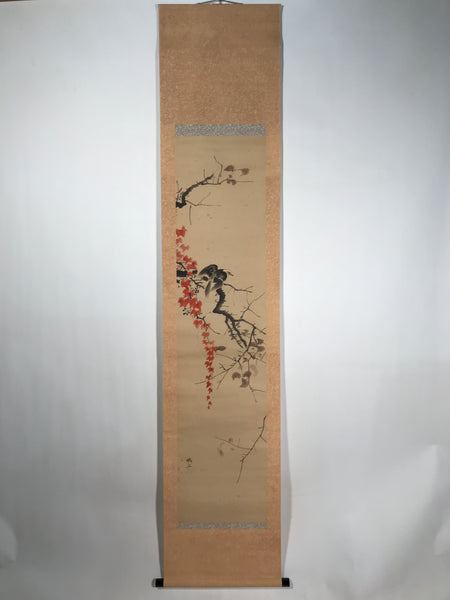 Antique Japanese Hanging Scroll Kakejiku Bird Muku Tree Fruit Red Leaves KJ192