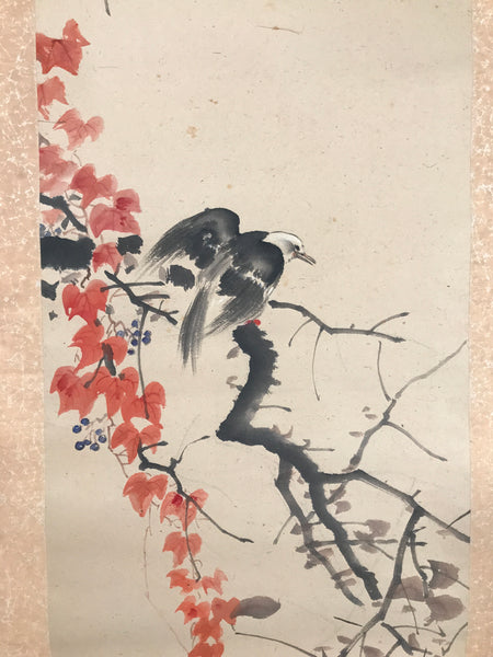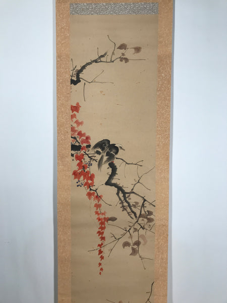 This antique Japanese hanging scroll (kakejiku or makimono) represents a bird, possibly a hawk, sitting on a tree, likely a muku tree. A vine with red leaves, an ivy or an asagao morning glory, is also pictured. This type of kakejiku is called kacho in Japanese, meaning birds and flowers. This elegant piece is perfect for fall/early winter but can be displayed all year. This piece is signed with a name.
