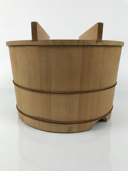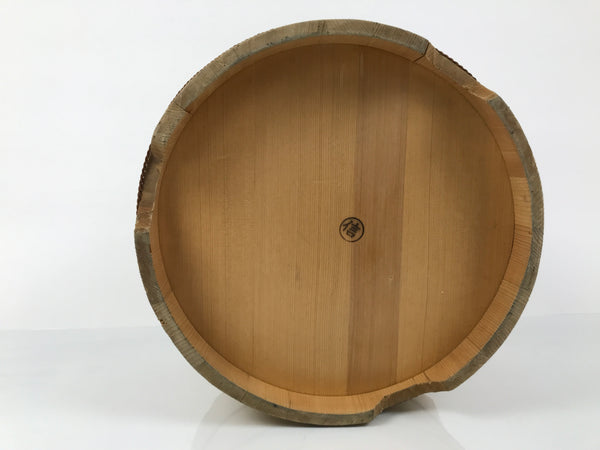 This is a handmade traditional Japanese lidded wooden bucket made for storing water, rice, or other food products. It is also commonly used for making pickles. Stout, sturdy, and a natural brown color, it is made from precisely cut slats of wood held together by four narrow, twisted copper metal bands via tension. This beautiful classic piece is also perfect for adding traditional flair to any home or office decor. It has a brand on the backside of the lid.
