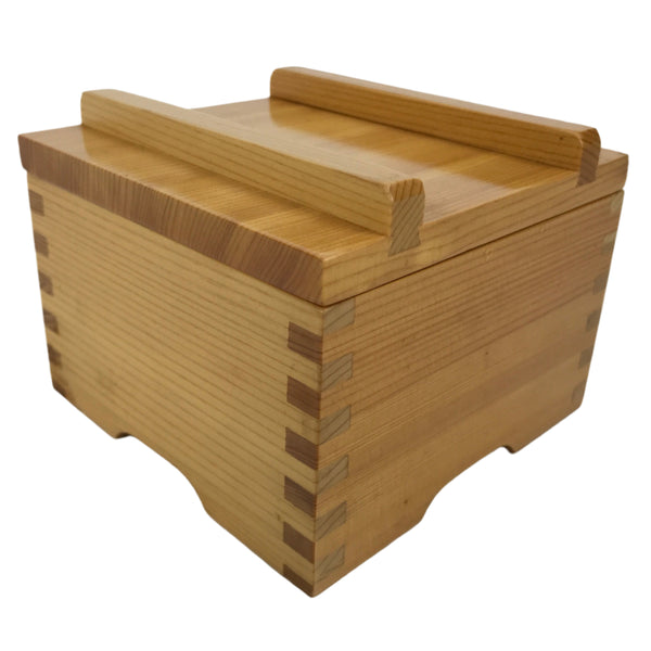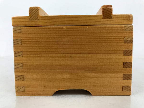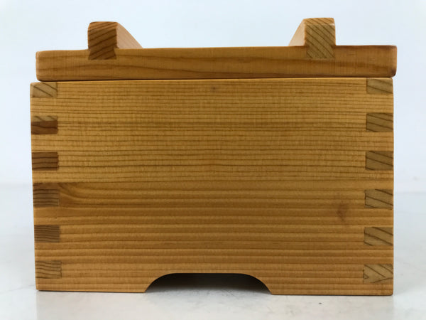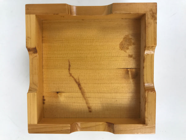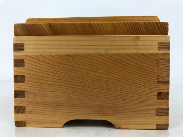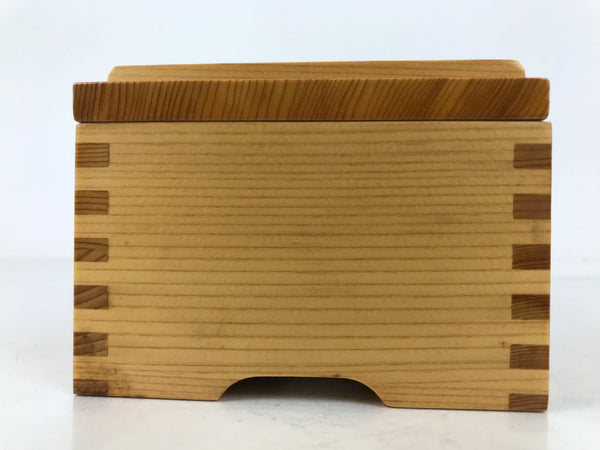 This is a vintage Japanese brushed lacquer wooden box with a lid. It is made of either cedar or cypress and brushed with a clear coat of lacquer to allow the fine natural wood grain to shine through. This piece is used as a serving dish for one of many small and elegant courses during a traditional kaiseki meal set.