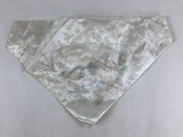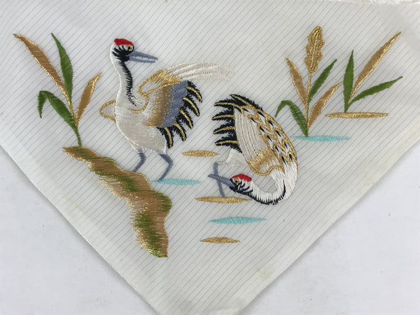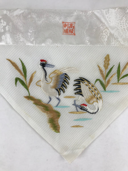This is a vintage Japanese Buddhist altar tablecloth Uchishiki. It has an embroidered crane (Tsuru) design. Triangular uchishiki is mainly used by followers of Jodo Shinshu Buddhism as the upper table (Maejyoku) and the front table (Uwajyoku) in the Buddhist altar during events such as New Year's Day, the equinoctial week, Obon, and memorial services.