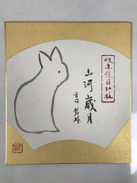 This vintage Japanese shikishi hand-painted art board represents a white rabbit with red eyes painted in a fan shape delimited by a gold background. It features a red stamp of a sanctuary in Gifu, a 4-character word, and a name. This piece is signed with a red seal.