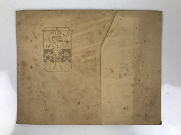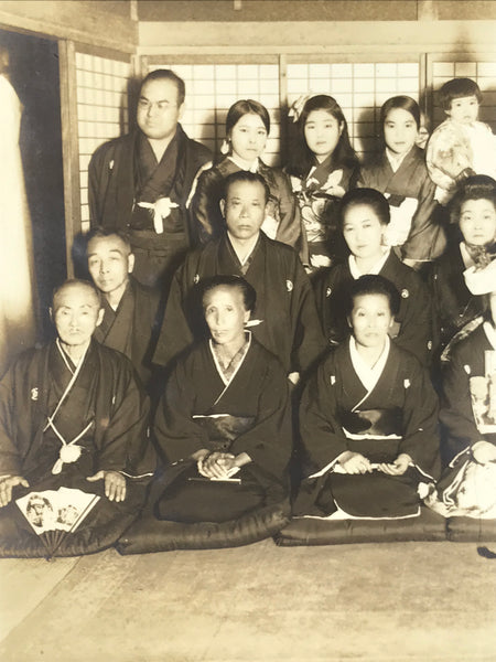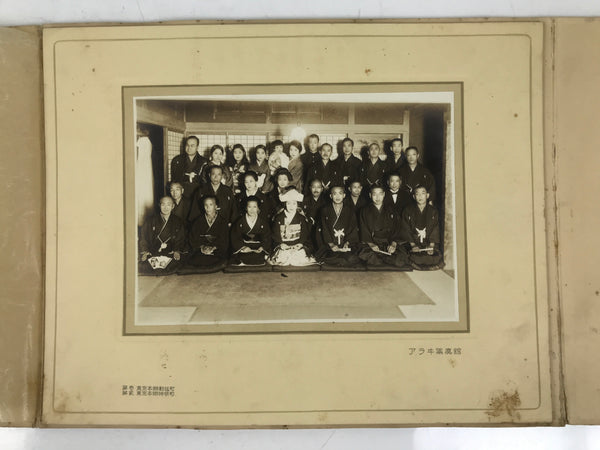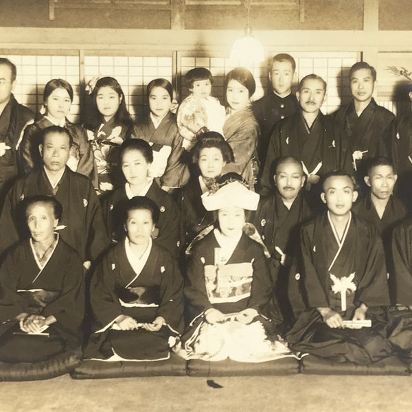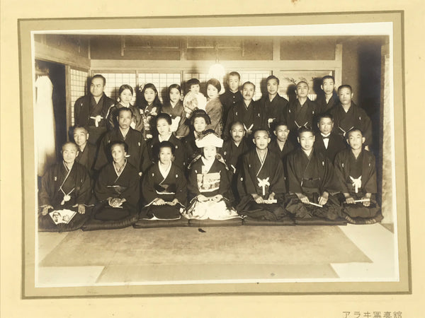 This is a vintage sepia tone wedding group photograph of a Japanese couple with family. The bride is wearing a traditional wedding-style kimono (uchikake). The groom and other male family members are wearing haori and hakama (kuromonpuku). The female family members wear a combination of colorful furisode (unmarried) and kurotomosode (married). This photo comes stored in a beige paper folding cover and has a translucent paper protector on the inside with the names and relation of each family member written.