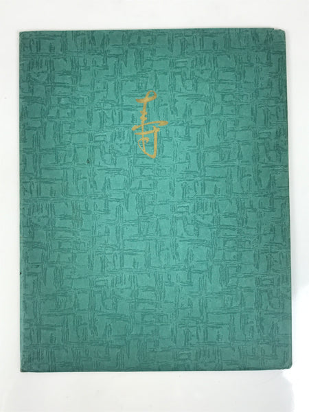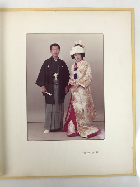 This is a vintage full color wedding photograph of a Japanese couple. Both bride and groom are wearing traditional wedding-style kimono and haori with hakama (uchikake and kuromonpuku). This photo comes stored in a gold paper folding cover with a giant red kanji character (寿 kotobuki, which is congratulatory and means longevity) with a teal-colored paper sleeve.