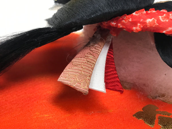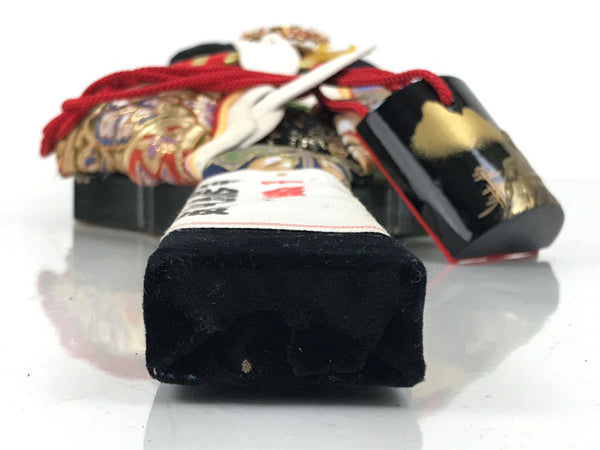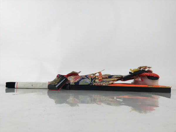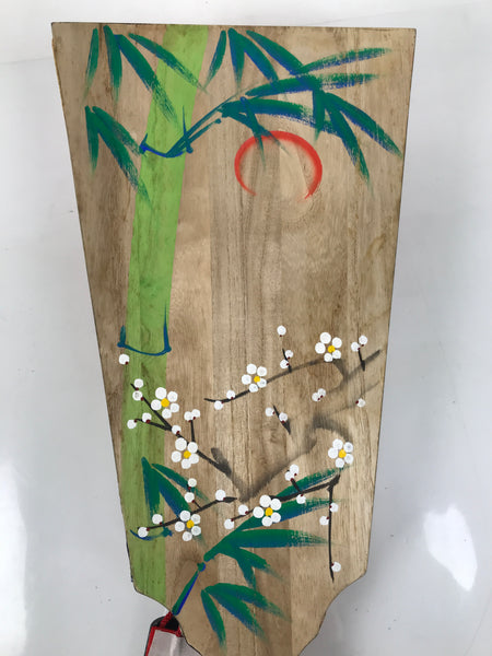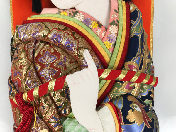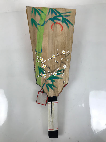 This Japanese vintage wooden paddle is decorated with a three-dimensional fabric art (Oshie-Hagoita) of a woman or geisha in a kimono, also called hagoita. It shows a Japanese woman (geisha) dressed in a gorgeous dark blue, brown, blue, black and gold kimono with a bird and floral patterns. The woman holds a wooden bag. The woman wears the traditional hairdo and gorgeous red and gold kanzashi hairpins. The cloth part of the kimono is made of silk. The back of the paddle is painted with bamboo leaves and flowers (plum blossoms or sakura cherry blossoms). The handle is covered with a black velvet fabric. **Shuttlecocks are not included.
