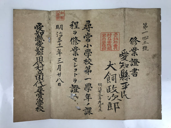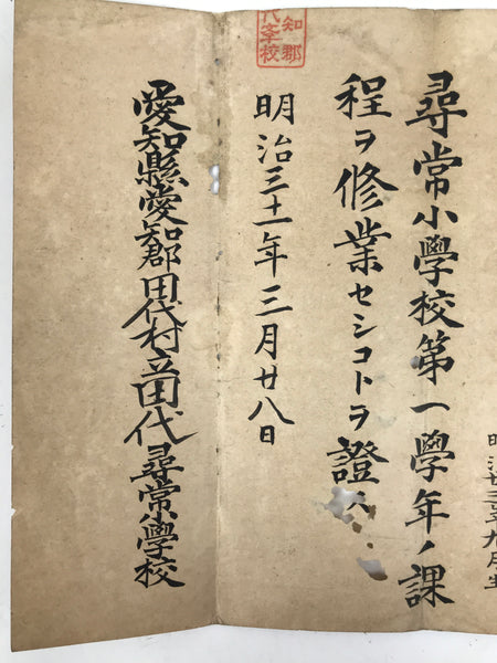 This antique Japanese elementary school third-grade certificate of completion is dated Meiji 31 (1898). It belonged to a student going to a school in Aichi.