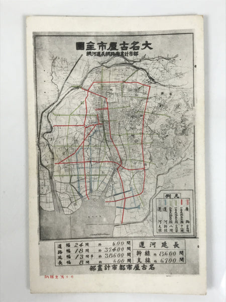 This is an antique Japanese souvenir postcard in color featuring a map of Nagoya's road and canal network system at the time. The map features a legend and some extra info at the bottom.