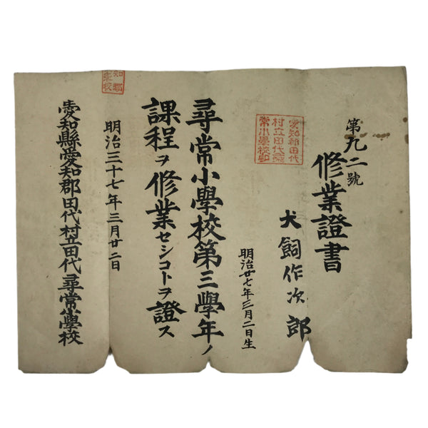This antique Japanese elementary school third-grade certificate of completion is dated Meiji 37 (1904). It belonged to a student going to a school in Aichi.