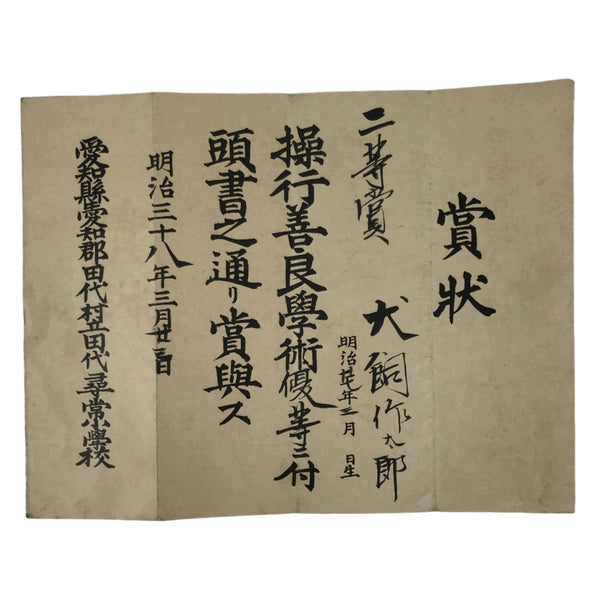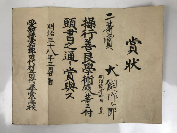 This antique Japanese elementary school certificate of good behaviour is dated Meiji 38 (1905). It belonged to a student attending school in Aichi.