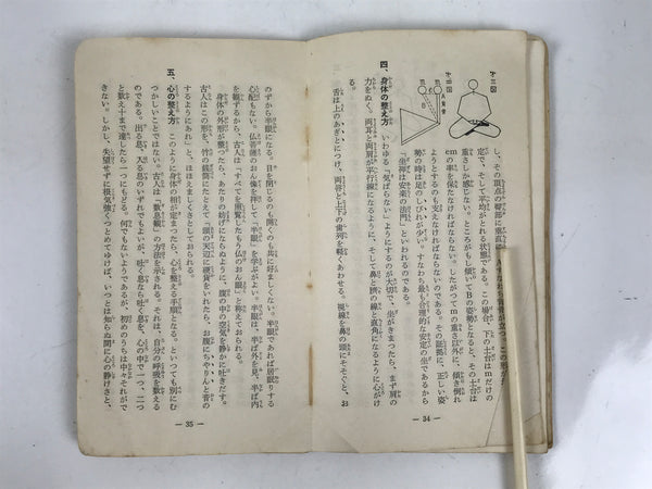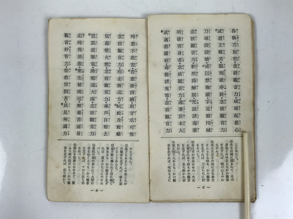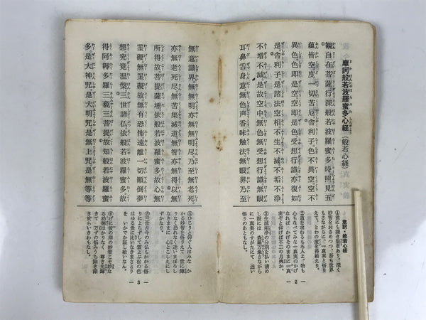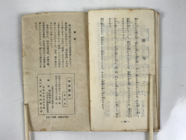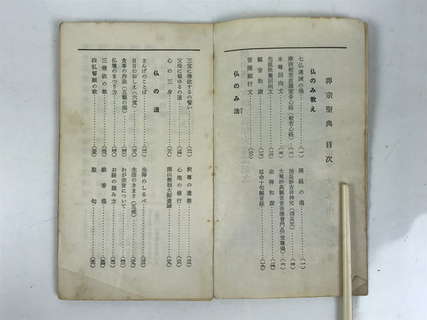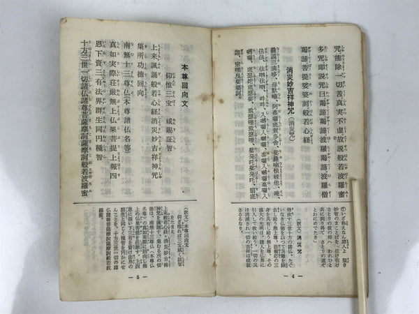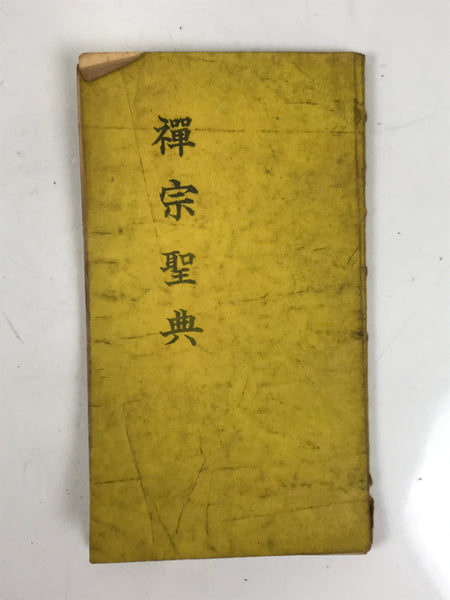 This vintage Japanese Buddhist book features sacred texts and sutras such as the Heart Sutra for the Rinzai (or Linji) school. The texts are related to the practice of Zen Buddhism. This book is from Myoushinji temple and was given as a commemorative. It has a yellow cover.