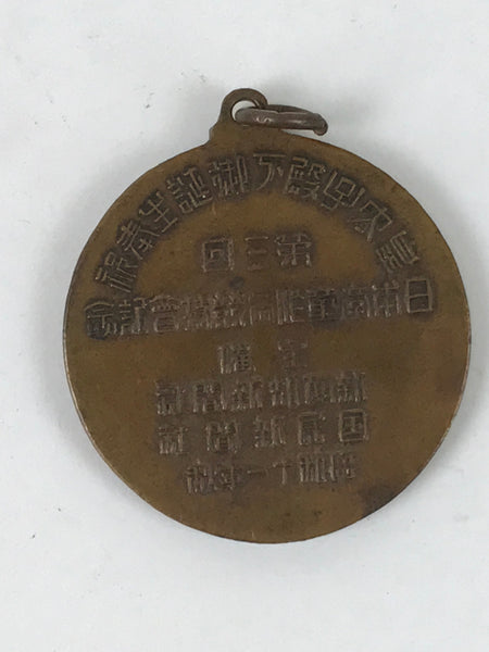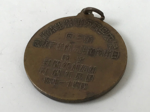 This vintage Japanese metal commemorative medal features a portrait of a man with a dragon and a phoenix at the front and inscriptions at the back.