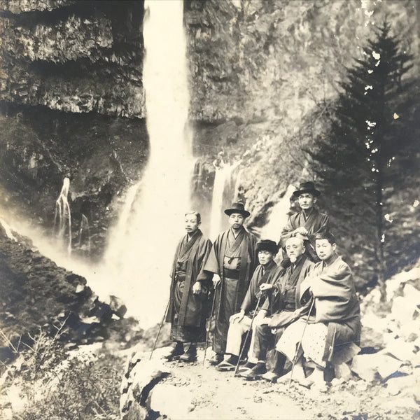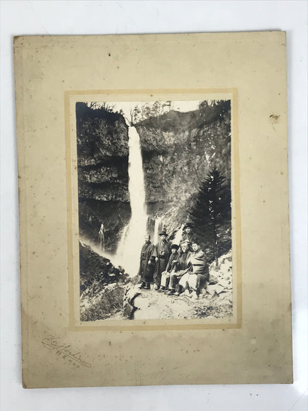 This is an antique travel souvenir portrait photograph taken in front of Kegon Falls in Nikko, a popular natural tourist destination. The photo depicts a group of gentlemen dressed in traveling kimono complete with traditional shoes and hiking sticks. It comes adhered to a thick paper card.