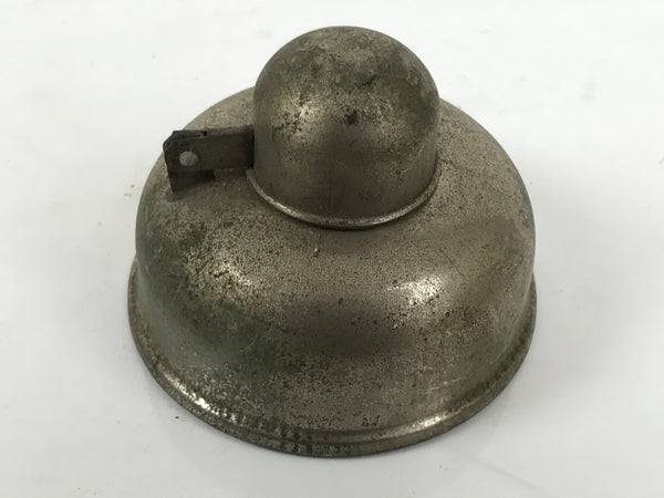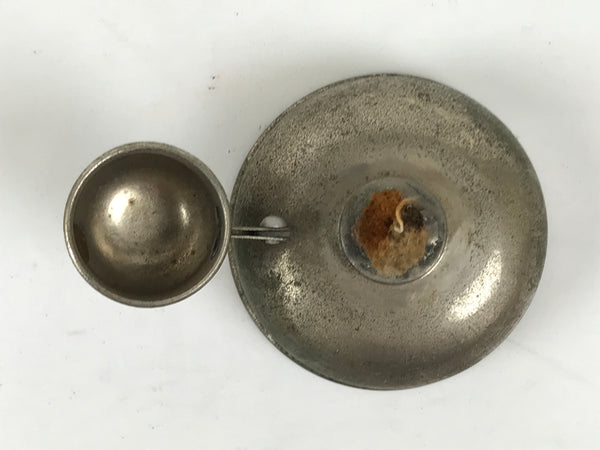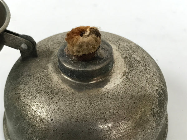 This is a vintage Japanese old-fashioned metal kerosene burner. It has a thick, braided cotton wick that appears to be unused. It is removable and sits inside the reservoir in the base. There is a rounded cap that flips open and closed on a small hinge and can also be used to snuff out the flame. This item would be used commonly among military, medical labs, and possibly during camping. **This item has not been tested**