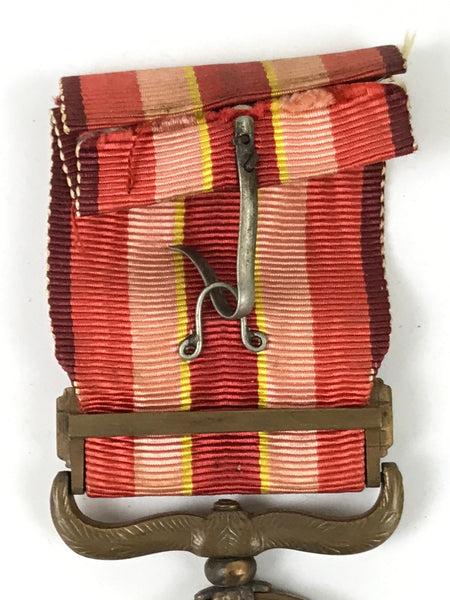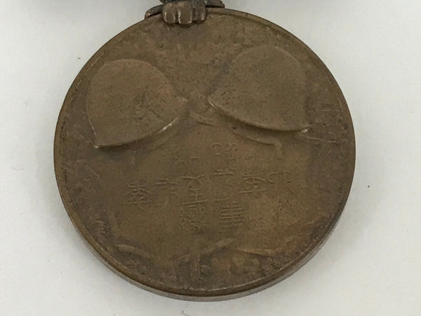This vintage Japanese medal of honor is for participating in the Second Sino-Japanese War, specifically the Mukden incident. It is called Showa Rokunen Aruiha Kyunen Jihen Jugun Kisho. It features Japanese characters on the front and the back, a design with a bird and a chrysanthemum flower on the front. It is made of fabric and metal and has a clip on the back for attachment.