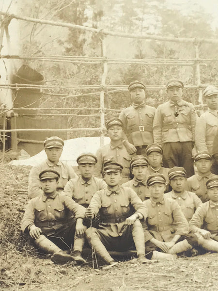This is an original vintage early Showa Era daily life photograph of a class of school boys and their teachers posing outside among bundles of wood. Even in modern Japan, tasks such as gardening, cleaning, crafting, etc are skills that are taught to students at most levels of schooling whether for a dedicated class or for the practical study of science. These students are being taught about a method of making charcoal (as said on the sign in the background). The students wear military-style uniforms.